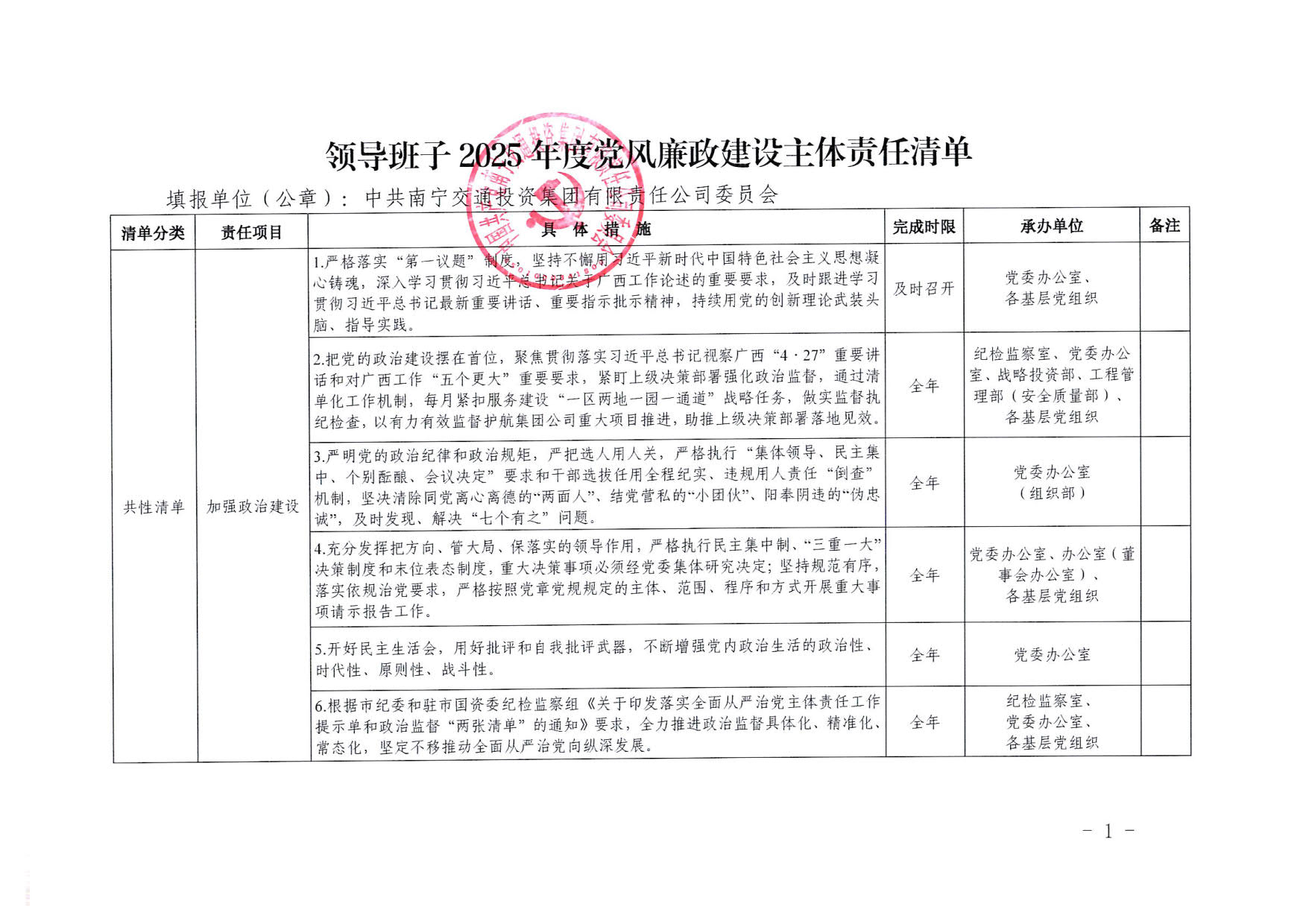 南寧交投集團(tuán)領(lǐng)導(dǎo)班子2025年度黨風(fēng)廉政建設(shè)主體責(zé)任清單